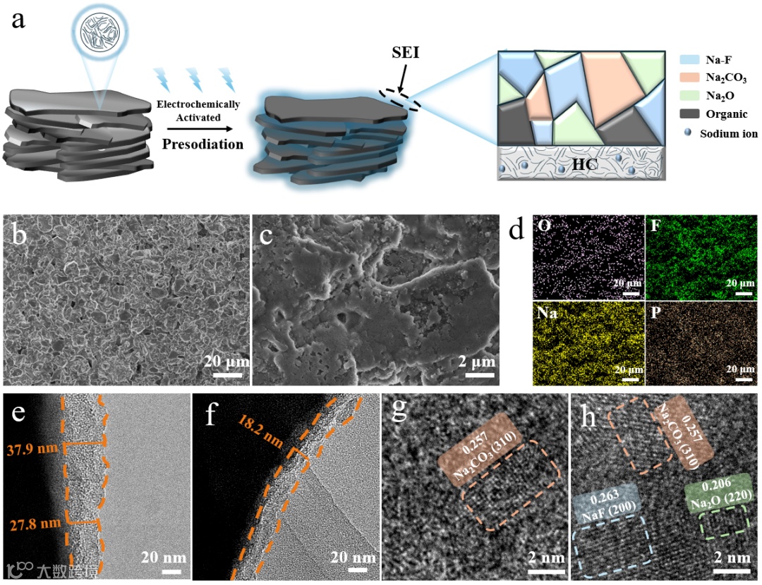 图1. (a) 预钠化过程及SEI层组成的示意图。(b, c) Ether-HC电极的SEM图像及(d)其EDS面分布图。(e, g) Ester-HC 和 (f, h) Ether-HC 电极的TEM图像。