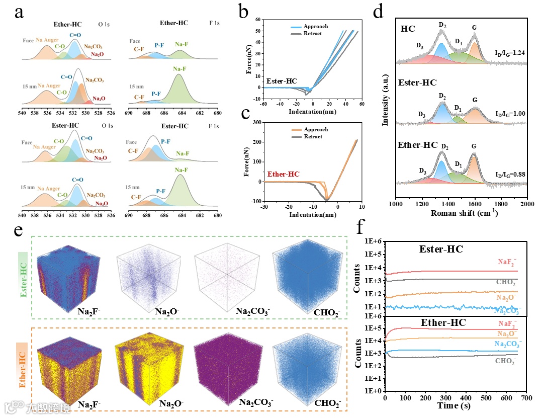 图2. (a) Ether-HC电极(上)和Ester-HC电极(下)上SEI的O 1s和F 1s深度剖析XPS光谱。(b) Ester-HC和(c) Ether-HC电极上选定区域所形成的SEI的代表性力-压痕曲线。(d) 原始HC、Ester-HC和Ether-HC电极的拉曼光谱。(e) Ether-HC和Ester-HHC电极的3D TOF-SIMS图谱。(f) 从TOF-SIMS测量中获得的离子碎片含量的定量分析。