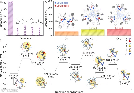 一系列对照实验(如非FLP配体稳定的、核心Cu数相同和不同的铜纳米团簇等活性均很低)排除了碳载体、游离配体或铜簇核本身是活性来源的可能性,证实催化性能完全来源于DPEphos与表面铜原子精确配位形成的FLP位点。如图4所示,催化活性与FLP位点数量呈近乎线性的正相关(Cu22和Cu28具有三个FLP位点,其活性是Cu4的1.5倍),这为"活性由FLP位点数量决定”提供了关键证据。DFT计算揭示了反应机理:水分子在Cu-O FLP位点上发生异裂,随后硅烷参与反应,最终生成硅醇和氢气。