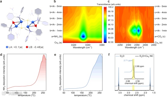 如图2所示,以Cu4为模型,通过理论与实验相结合的方法确认了其表面的FLP特性。Mulliken电荷分析显示Cu-O对存在明显的电荷分离。原位DRIFTS实验证明,表面的Cu位点(LA)可以化学吸附NH3,而O位点(LB)可以化学吸附CO2。程序升温脱附(TPD)进一步证实了LA和LB位点的存在。最重要的是,通过氘代核磁(2H NMR)观测到了D2O在Cu4簇存在时表现出的特征信号偏移,为FLP位点活化水分子提供了直接光谱证据。