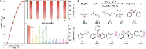 基于其优异的活化水的能力,负载型Cu4/XC-72催化剂在有机硅烷水解为硅醇的反应中表现出接近定量的转化率和良好的循环稳定性,如图3所示。