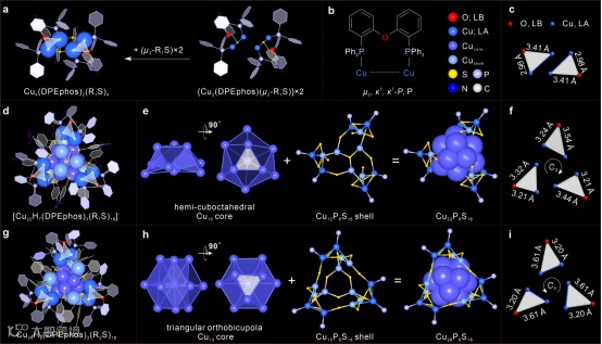 利用双齿膦配体DPEphos对铜簇进行功能化,成功合成了三个结构精确的FLPCluster:Cu4、Cu22和Cu28,它们的单晶结构分析如图1所示。单晶X射线衍射分析表明,这三种簇均具有精确的分子结构,且DPEphos配体均采取μ2,κ1,κ1-P,P的配位模式,其醚氧原子因空间位阻和几何约束而呈“悬挂”状态,与邻近的铜中心形成了非键合接近,这构成了FLP的结构基础。多种光谱表征(XPS、NMR、UV-vis、HRESI-MS等)证实了团簇的组成、纯度、Cu(I)价态和溶液稳定性。