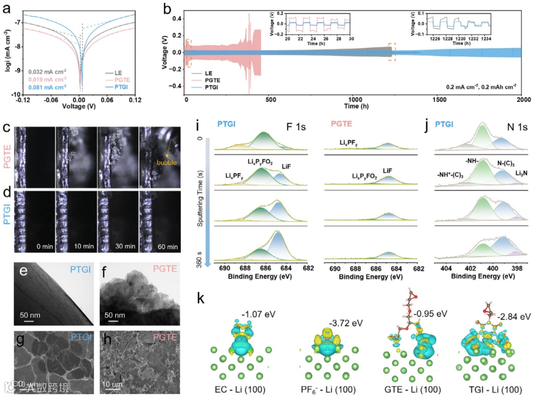 图3. a) 锂对称电池的Tafel图。b) 锂对称电池的剥落沉积测试。c-d) 锂对称电池 在1.0 mA cm−2下的原位枝晶生长图像。e-f) PGTE 与PTGI在25次循环后锂电极的SEI结构的HR-TEM图像。g-h) 锂对称电池经过600 h后锂电极的SEM图像。i-j) 循环后锂电极的F 1s和N 1s的深度 XPS 光谱。k) 吸附在锂表面的不同分子的几何优化原子构型。
