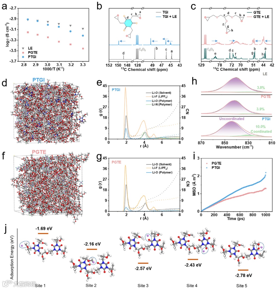 图2. a) PTGI离子电导率随温度的变化曲线。b-c) TGI和GTE加入锂盐前后(以C6D6为溶剂)的13C核磁谱。d-g) PTGI 与PGTE 电解质的MD和径向分布函数。h) PF6−配位的红外光谱分析。i) PTGI 和 PGTE 中Li+的 MSD 。j) Li+和 PTGI 在不同配位位点的结合能。