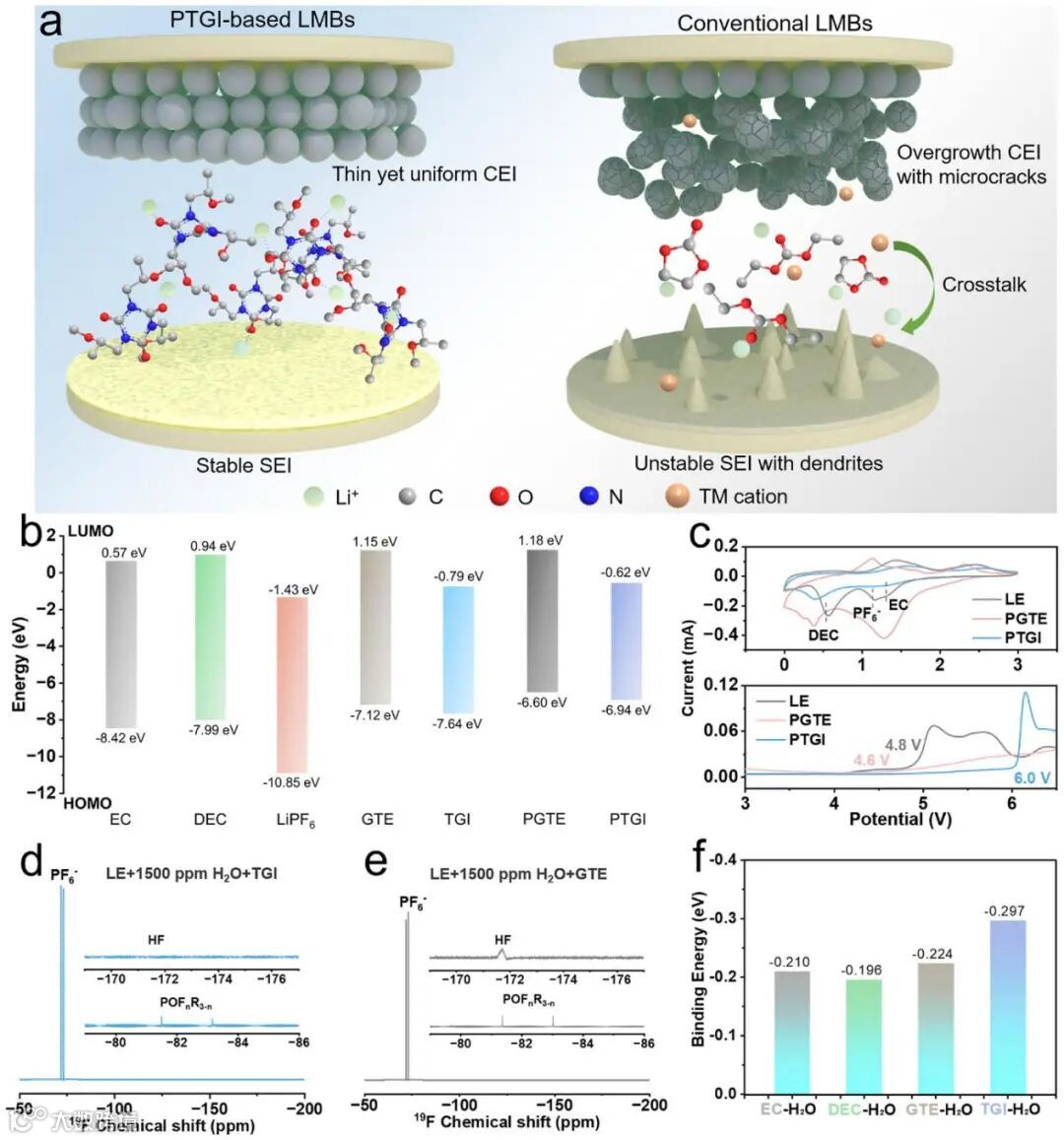 图1. PTGI 的理论计算与化学性质。a) 基于 PTGI 与传统LMBs的示意图。b) 不同组分的HOMO与 LUMO 能级对比。c) 不同电解质的首次循环伏安曲线与LSV曲线。d-e) 加入水后LE+TGI和LE+GTE的19F 核磁分析,各样品均不含LiODFB。f) 水与溶剂及单体的结合能。