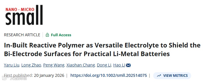 Yaru Liu#, Long Zhao#, Peng Wang#, Xiaohan Chang, Dong Li, Hao Li*. In-Built Reactive Polymer as Versatile Electrolyte to Shield the Bi-Electrode Surfaces for Practical Li-Metal Batteries, Small 2026.