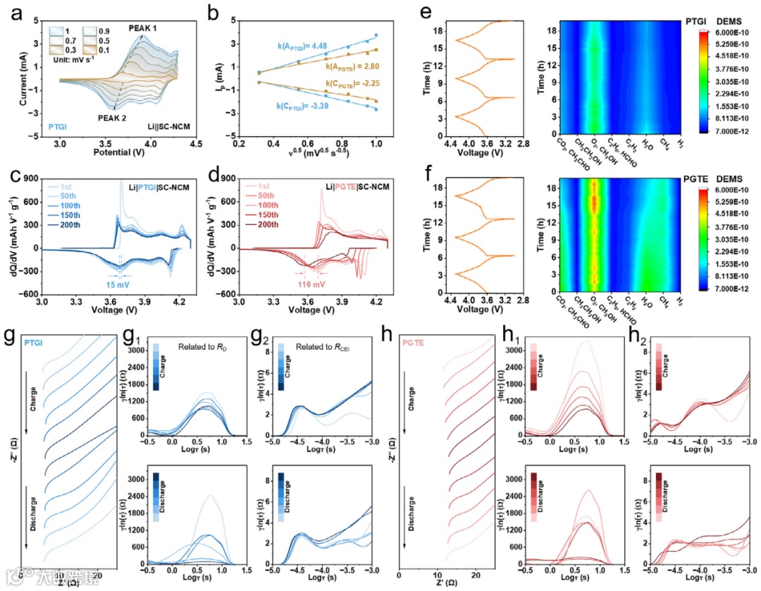 图5. a) 扫描范围 从0.1到1.0 mV s−1的循环伏安图,以及 b) PTGI和PGTE基 Li||SC-NCM 电池的峰值电流与扫描速率平方根的关系。c-d) PTGI 和PGTE 基Li||SC-NCM 电池在不同充放电过程中的dQ/dV曲线。e-f) PTGI 和PGTE 基Li||SC-NCM 电池的原位差分电化学质谱。g-h) SC-NCM||SC-NCM对称电池的原位EIS及相应的DRT变换图。