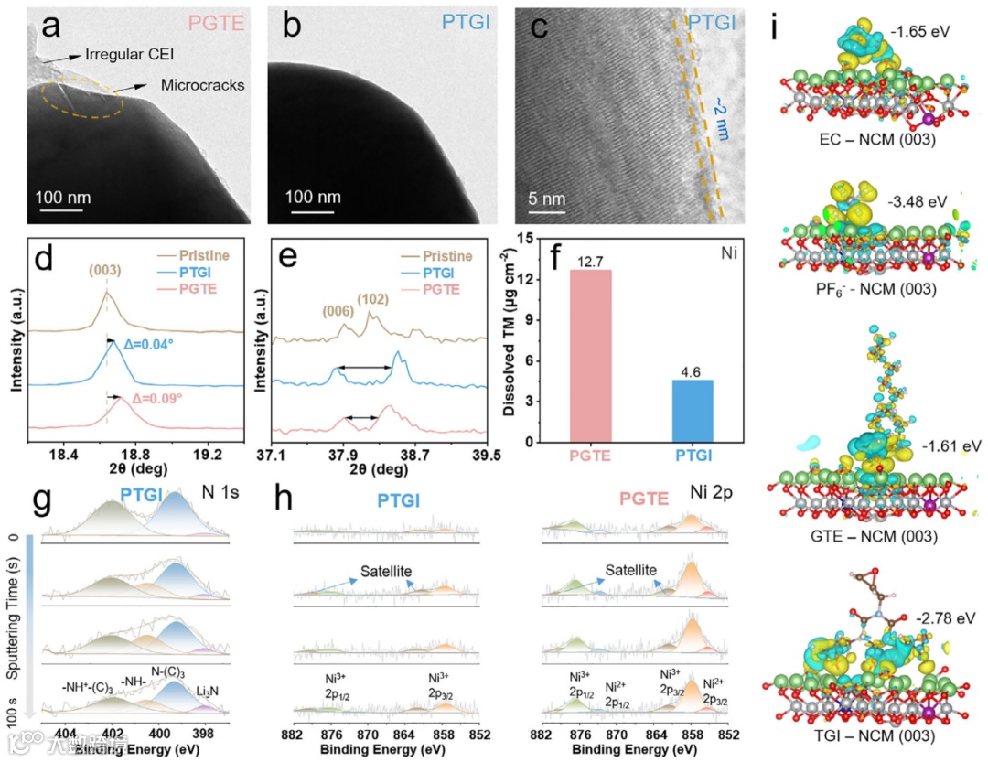 HR-TEM、XRD、ICP-MS 及 XPS 测试表明,PTGI 可在 SC-NCM 表面形成薄而均匀的 CEI 层,抑制颗粒开裂与晶格畸变,减少过渡金属溶解。DFT 吸附能计算显示TGI与正极的吸附作用更强,能通过 N-(C)₃键清除 HF,稳定电极结构与界面。