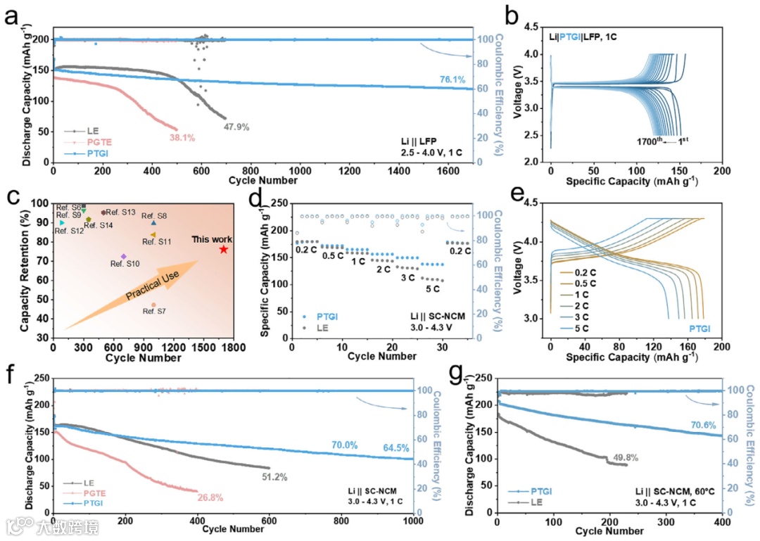 图4. a) Li|PTGI|LFP 电池在1C下的循环性能。b) LFP全电池的充放电曲线。c) 全电池循环寿命和容量保持率对比。d) Li|PTGI|SC-NCM 电池的倍率性能。e) 不同倍率下的充放电曲线。f) Li|PTGI|SC-NCM 电池在1C下的循环测试。g) Li|PTGI|SC-NCM 在60℃下的循环测试。