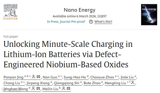 近日,美国佐治亚理工学院刘美林教授、陕西科技大学景盼盼副教授、台湾师范大学王祯瀚教授等人在国际知名期刊Nano Energy上发表题为“Unlocking Minute-Scale Charging in Lithium-Ion Batteries via Defect-Engineered Niobium-Based Oxides”的文章。该文章通过固相反应和改进的表面氧空位工程,成功制备了一种高容量的微米级Nb14W3O44-δ负极颗粒。这种改进的表面氧空位工程通过产生额外的电荷载流子、激活表面氧化还原位点并实现无势垒离子扩散,显著提升了电子电导率和离子电导率,进而在不牺牲结构稳定的前提下,共同推动赝电容锂离子存储。所制得的Nb14W3O44-δ负极表现出优异的性能:初始容量高达303 mAh g-1,库伦效率超过93%,体积变化可忽略不计(约0.2%),在75 C(1C = 200 mAh g-1)下循环7500次仍能保持90%的初始容量。同时,匹配的LiFePO4 ׀׀ Nb14W3O44-δ全电池具有160 Wh kg-1的能量密度,并能够在10 C下实现分钟级快充,稳定循环次数超2000次。本研究表明,表面氧空位工程是提升剪切结构铌基氧化物(如Ti2Nb10O29)电化学性能的有效策略,为构建实用性、高功率锂离子电池提供了新思路。