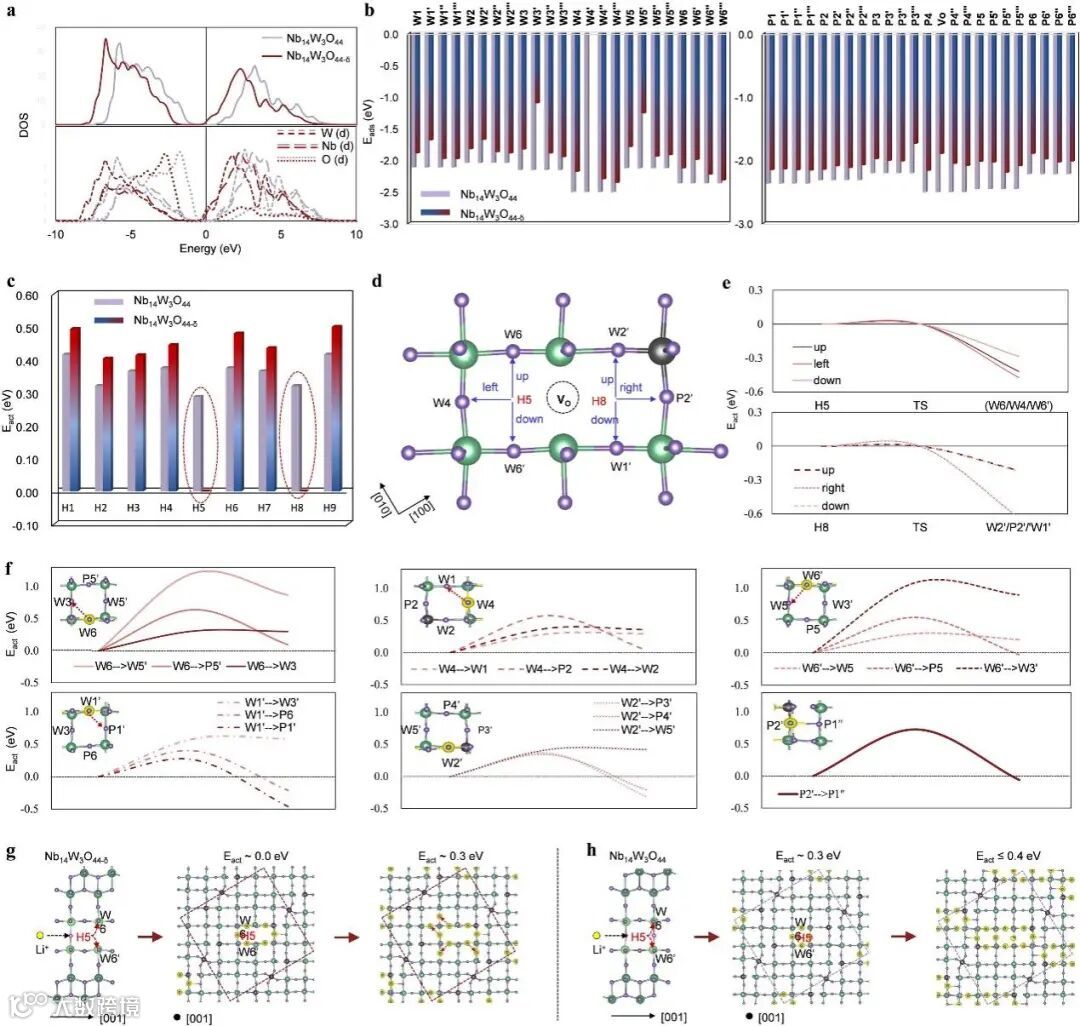 图2. Nb14W3O44-δ模型与的理论研究。(a) DOS,(b) Li+在W位和P位的吸附能(Eads),(c) Li+沿[001]方向的活化能(Eact),(d) Nb14W3O44-δ模型中Li+在-Block平面上从H5和H8位点向近邻位点(H5: W4, W6, W6’; H8: W1’, P2’, W2’)迁移的可能路径及 (e) 对应的Eact,(f) Li+在Block平面上分别从近邻位点(W6、W4、W6’、W1’、P2’、W2’)向次近邻位点迁移的Eact,(g, h) 基于能量结果的两种负极模型之间Li+扩散模式的对比。
