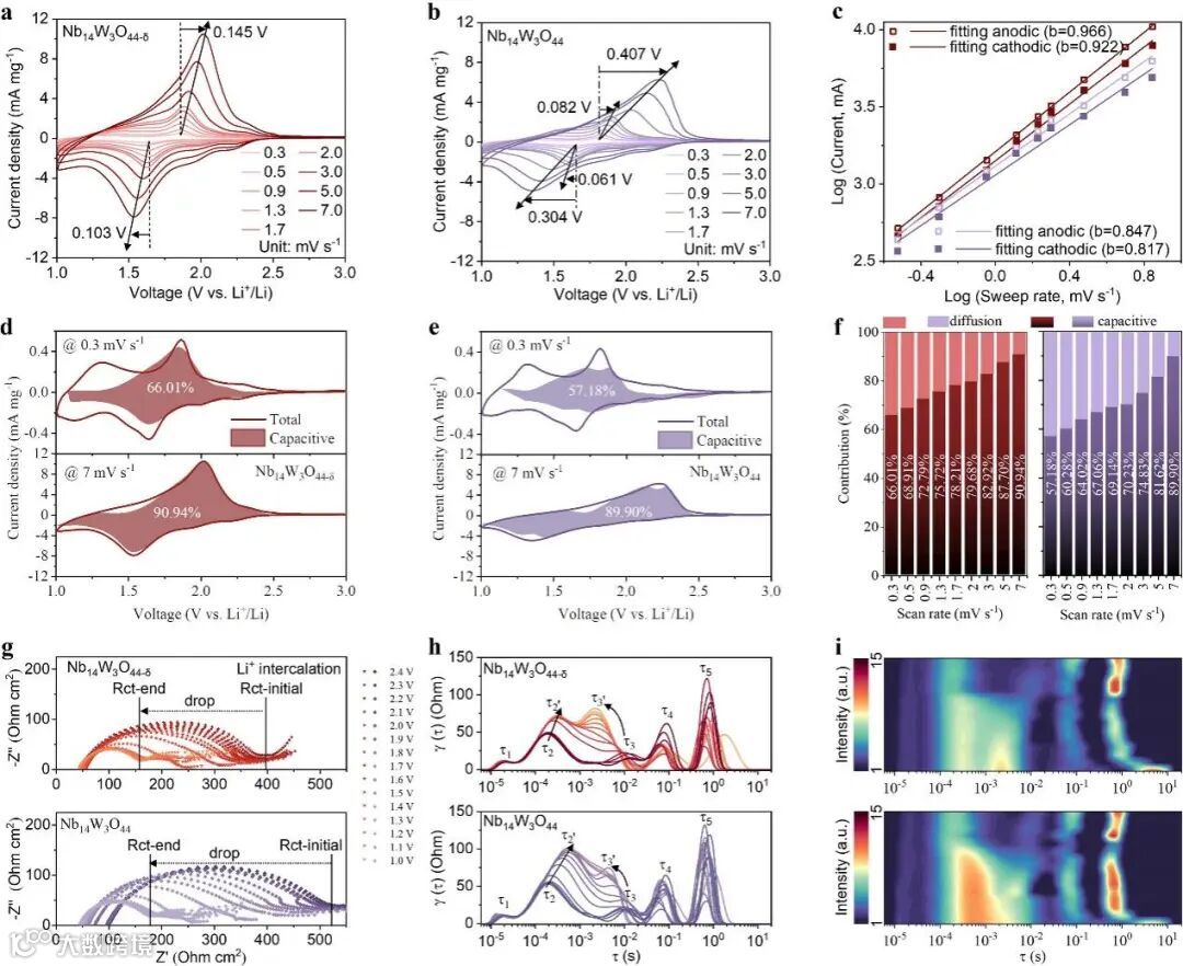 图3. Nb14W3O44-δ和Nb14W3O44负极的赝电容储锂性能和界面电阻对比。(a, b) 0.3~7.0 mV s-1范围内不同扫速下的CV曲线,(c) 利用阳/阴极峰值电流与扫速的线性关系确定的b值,(d, e) 分别在0.3和7.0 mV s-1下测试的CV曲线与拟合的电容控制的CV曲线的对比,(f) 不同扫速下电容控制的存储贡献,Li+嵌入过程中的 (g) 阻抗谱及 (h, i) 对应的DRT分析。