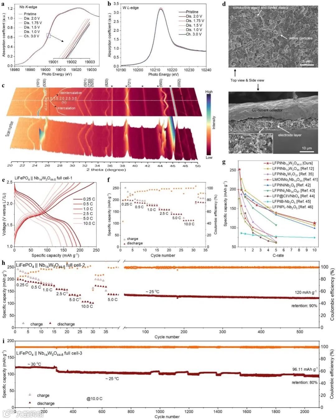 图5. Nb14W3O44-δ负极的可逆性及全电池性能评估。(a, b) Nb的K边和W的L边X射线近边吸收结构谱(XANES),(c) 0.5 C下的一次充放电过程中,在20-50°范围内的原位二维和三维XRD等高线图及对应的GCD曲线,(d) 在10 C下循环1400圈后电极表面与截面的SEM图,(e-g) 倍率性能及其与相关文献的对比,(h, i) 在1.0-2.5 V的最优电压窗口下运行的LiFePO4 ׀׀ Nb14W3O44-δ全电池分别在5 C和10 C下的超长循环性能。