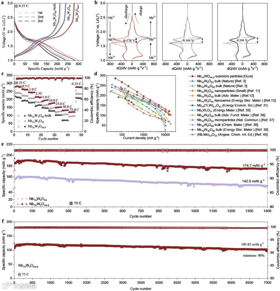 图4. Nb14W3O44-δ负极和对照组 (微米级Nb14W3O44负极和Nb14W3O44-bulk负极) 在半电池中的电化学储锂性能对比。(a, b) 0.25 C下的前三圈GCD曲线和相应的dQ/dV曲线,(c, d) 倍率性能及与相关文献的对比,(e) 在10 C下循环1400次和 (f) 在75 C下循环7500次的长循环测试。