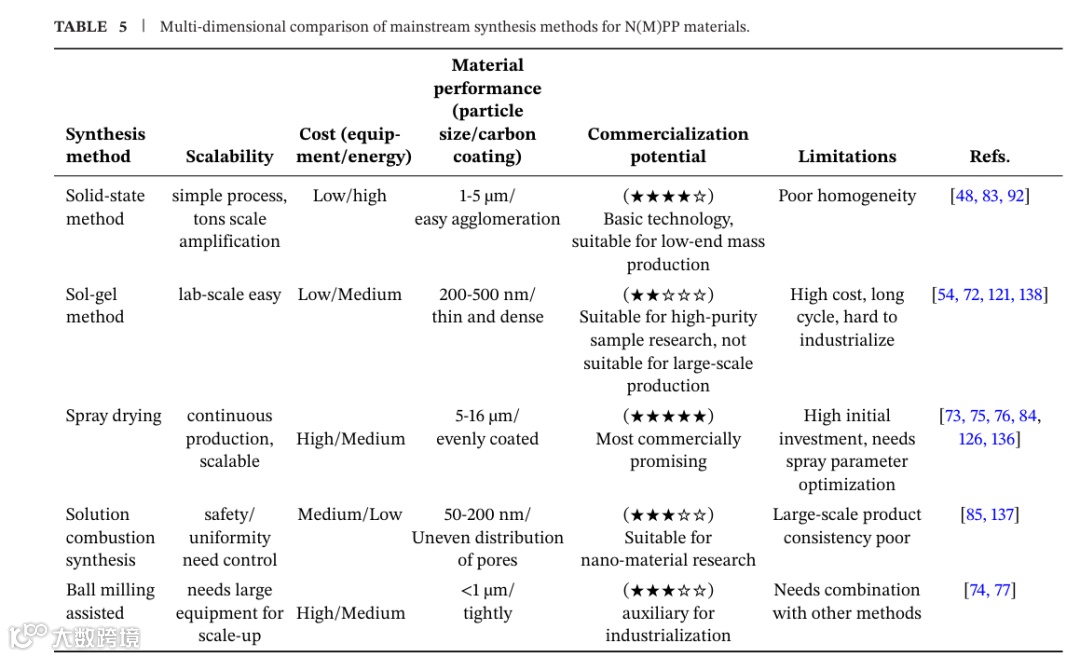 针对文章中呈现的不同合成方法的对比,对材料的合成方法进行总结与对比,主要涉及固相法,溶胶 - 凝胶法,喷雾干燥法以及溶液燃烧合成法,其中针对不同的实验目的与方法喷雾干燥是实现大规模生产以及商业化的方法,其通常结合结合球磨辅助(如球磨辅助喷雾干燥法)可进一步提升原料均一性,为实际生产中材料的性能提供更大的帮助。而针对其他合成方法,只在实验室范围内的高纯度样品的合成,难以大规模化放大。