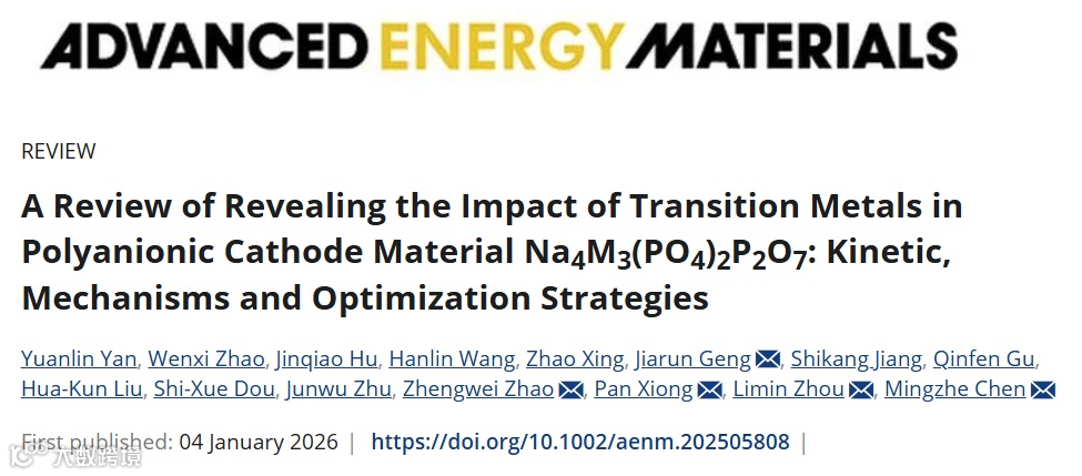 近日,来自南京理工大学的陈明哲教授、周丽敏教授、熊攀教授、耿嘉润博士与浙江昌意钠电储能有限公司的赵政威研究员合作,在国际知名期刊Advanced Energy Materials上发表题为“A Review of Revealing the Impact of Transition Metals in Polyanionic Cathode Material Na₄M₃(PO₄)₂P₂O₇: Kinetic, Mechanisms and Optimization Strategies” 的综述文章。该综述系统梳理了 N (M) PP 体系的研究进展,聚焦晶体结构、钠离子迁移机制与电化学性能优化策略,重点阐述了铁基材料的多维改性方法,深入分析了 Co、Mn、Ni 基材料的特性与挑战,并探讨了高电压电解液的优化方向,为该体系的设计提供了理论指导。