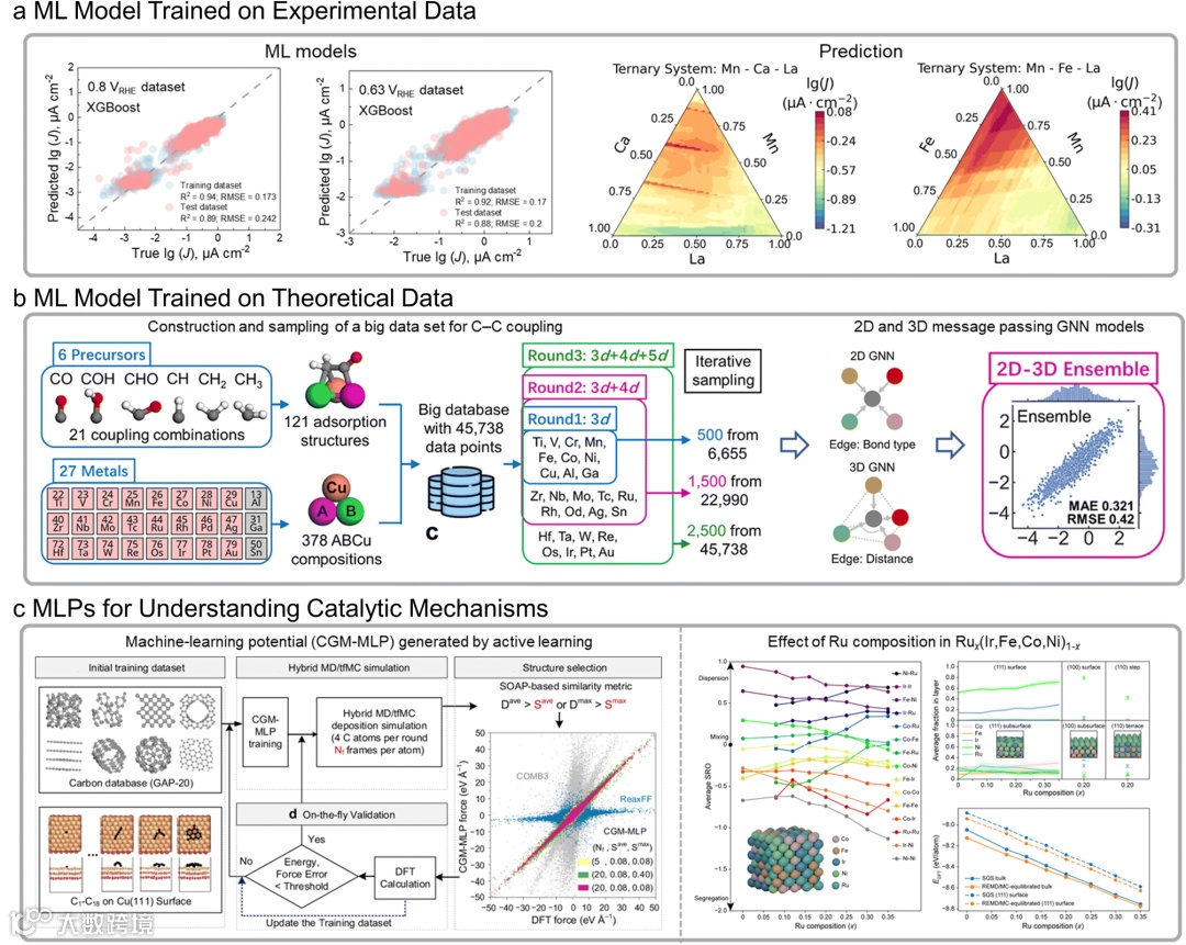 图6 机器学习(ML)用于催化性能预测的示例,包括基于实验与理论数据训练的模型,以及采用机器学习势(MLPs)的模型。(a)对角散点图:XGBoost 在 0.8 和 0.63 VRHE 条件下对训练集与测试集的实验值与预测值对比;同时给出等高线图,展示模型对不同多组分金属氧化物电流密度的预测分布。(b)用于 C–C 偶联大数据集预测的二维–三维(2D–3D)集成模型的构建。(c)左:在混合分子动力学与带时间戳的力偏置蒙特卡洛(MD/tfMC)模拟过程中,通过在线主动学习(active learning on-the-fly)生成机器学习势(MLP)的示意图。 右:将 MLP 与复本交换分子动力学及基于蒙特卡洛的原子交换(REMD/MC)相结合的理论分析,用于理解催化行为。