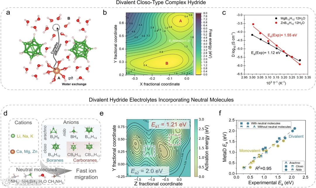 图4 固态电解质(SSEs)的代表性物理模型。(a)[Mg(H2O)x]2+ 水合络合物沿迁移路径(方向:A → B)迁移至下一个空位的示意。(b)MgB12H12·12H2O 中 A → B 迁移过程的势能面。(c)实验电导率随温度变化的关系。(d)氢化物固态电解质(hydride SSEs)中典型的阳离子、阴离子与中性分子。(e)通过 MetaD(元动力学)模拟捕捉到的 Mg(BH4)2·2NH3 的势能面。(f)实验活化能(Ea)与 MetaD 模拟得到的 Ea 对比:包含中性分子的结构(实心符号)与不含中性分子的结构(半实心符号)。