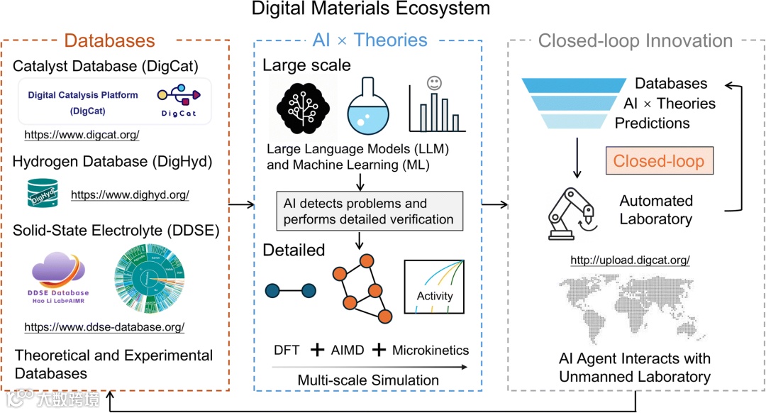 图1 数字材料生态(Digital Materials Ecosystem)概念示意图。该概念由三部分构成:数据库(左框)、AI与理论框架(中框),以及基于现代实验技术的闭环创新体系(右框)。