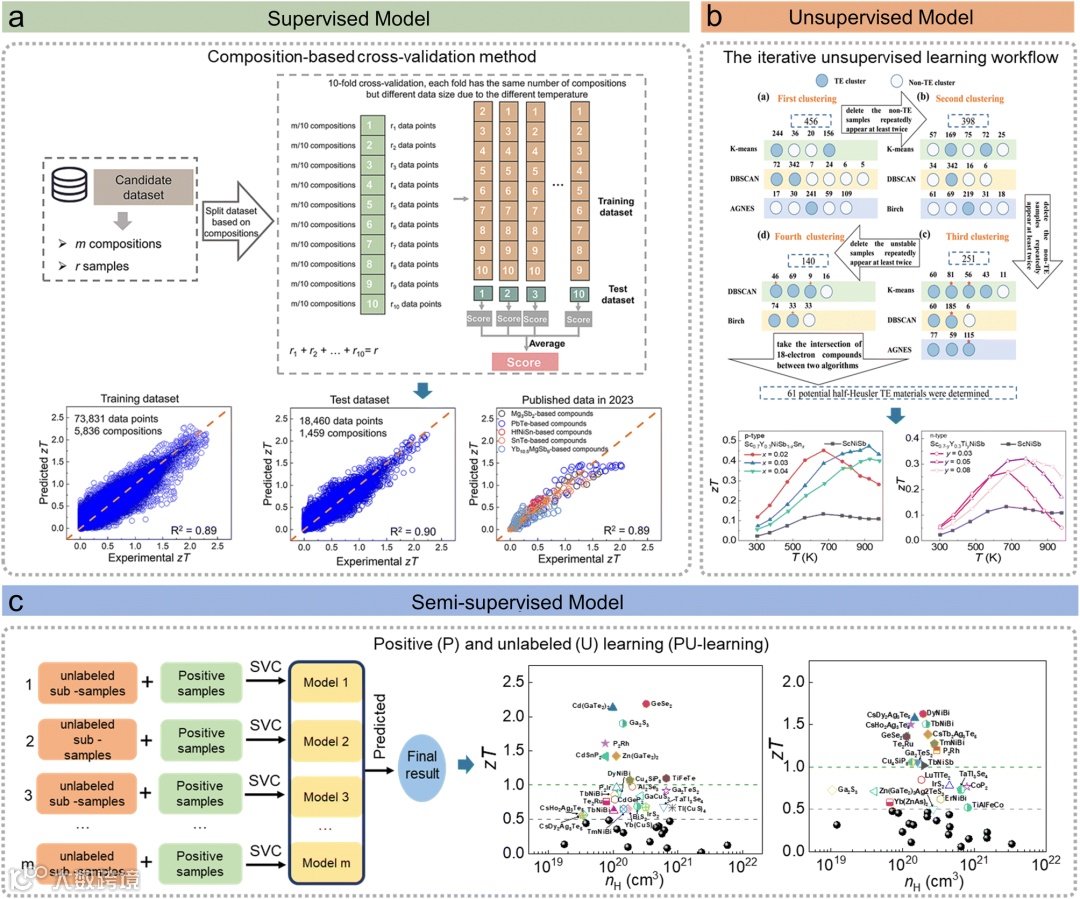 图5 用于材料性质预测的机器学习(ML)模型示例,包括监督学习模型、无监督学习模型与半监督学习模型。(a)基于组分的10折交叉验证策略示意图,并比较了ML模型在训练集、测试集以及发表于2023年的独立数据集上的表现。(b)将无监督ML与已标注并报道的半Heusler热电(TE)材料进行迭代整合,并对基于ScNiSb的热电材料开展了实验研究。(c)采用自助聚合(bootstrap aggregating,bagging)技术的PU学习框架,所识别的潜在热电材料通过理论计算进行了验证。