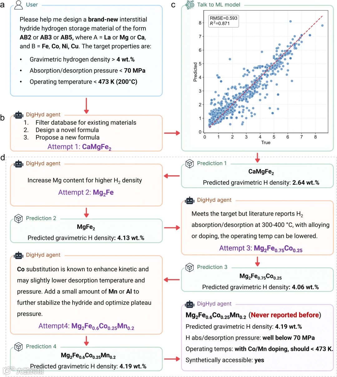 图10 AI智能体驱动的新型储氢材料发现工作流。(a)用户提出关键需求,包括材料类型、组成元素与性能目标。(b)DigHyd 智能体基于对4000余篇历史文献的数据挖掘,提出初始候选组分。(c)利用预训练的机器学习模型评估候选组分,预测其质量储氢密度。(d)DigHyd 智能体可在数分钟内根据研究者设定目标快速生成方案、完成预测并进行迭代优化。最终,DigHyd 智能体输出最终材料设计方案,并给出相关反应条件及合成可行性评估。