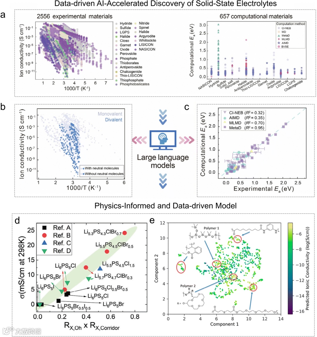 图9 数据驱动、AI加速的固态电解质(SSEs)发现。(a)约3000种实验材料的离子电导率—温度倒数关系,以及约700种计算材料的活化能分布。(b)一价与二价SSE的电导率—温度倒数关系,对比含/不含中性分子的情况。(c)不同方法下计算与实验活化能的对比。(d)298 K 下离子电导率与硫化物SSE结构描述符之间的关系。(e)基于结构组分预测的聚合物电解质离子电导率。