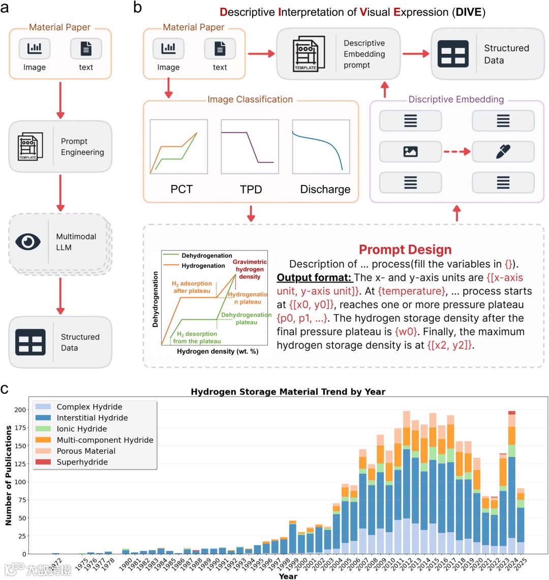 图8 多模态数据提取流程:视觉表达的描述性解读(DIVE)。(a)基于单一多模态大语言模型(LLM)的传统提取流程。(b)DIVE 提取流程:通过描述性提示词嵌入关键数据点,并生成用于结构化数据提取的“图像替代表示”。(c)按不同类型储氢材料分类的年度发文趋势。