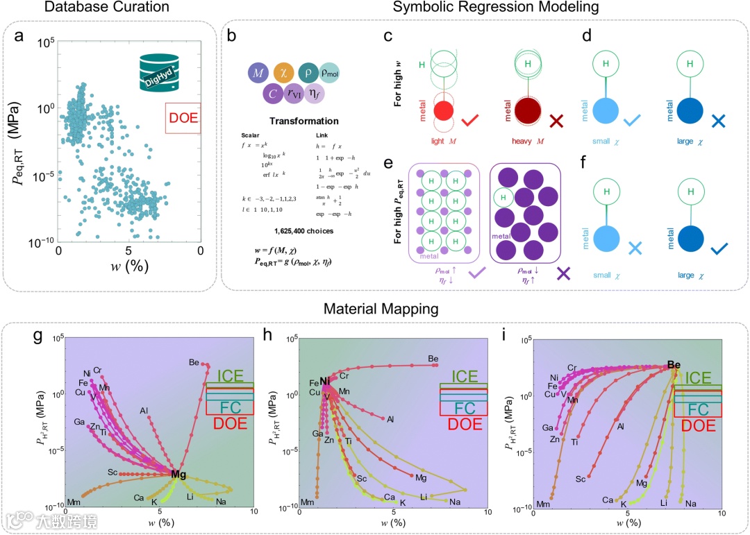 图7 面向可物理解释的氢储存性质机器学习建模:一体化模拟视角。(a)DigHyd 数据库概览,展示已报道金属氢化物中平衡压力与质量储氢容量的广泛分布,揭示两者之间不可避免的权衡关系,以及与美国能源部(US-DOE)目标之间的差距。(b)符号回归(symbolic regression)建模框架:系统搜索具有化学意义的描述符组合及其非线性变换,构建数以百万计的候选方程。(c–f)对决定 𝑤 与 𝑃eq 的关键描述符的示意性物理解释。(g–i)基于回归模型生成的“描述符—设计”地图,分别以 Mg、Ni、Be 为锚定组分的组成体系为例。该地图可视化了连接盐类型与间隙型氢化物的组成路径,并指出含 Be 的体系,尤其是 Be–Na 合金,能够独特地逼近 US-DOE 目标区域(红=终极目标,绿=内燃机,蓝=燃料电池)。