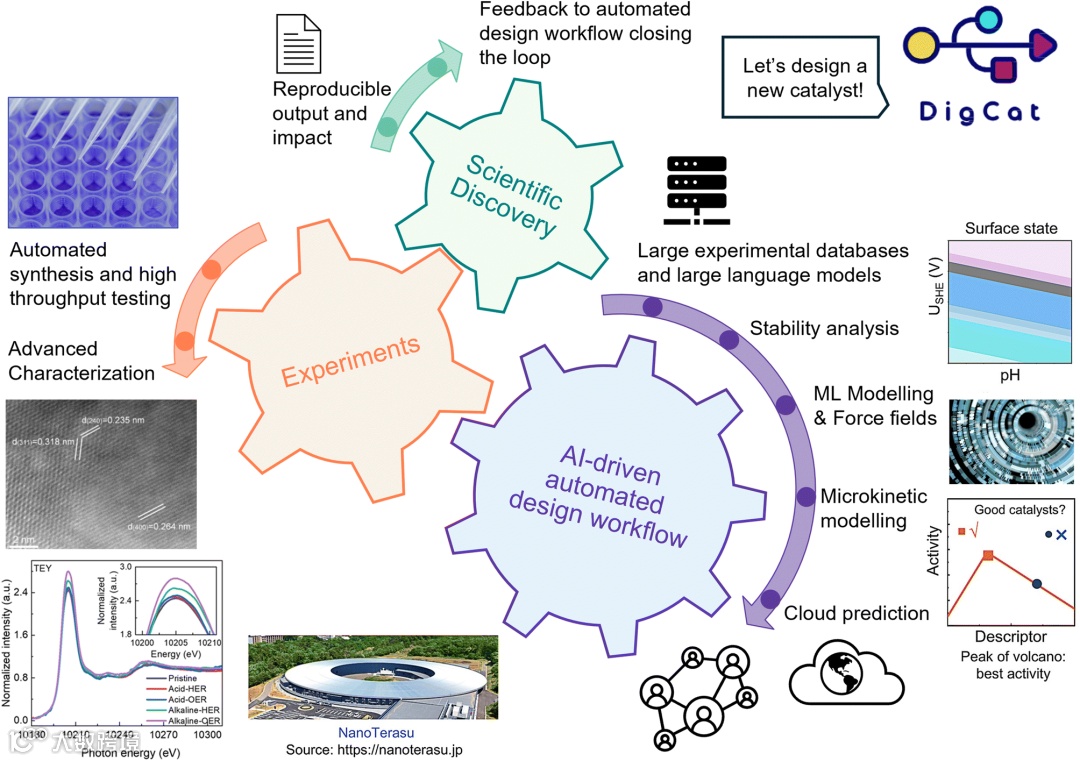 图11 面向闭环框架的、由AI驱动的自动化设计全流程(云端合成占位引用)。 该一体化设计框架将高通量实验、AI驱动的自动化工作流与科学洞见相连接,以加速催化剂开发。通过将机器人实验与先进表征手段与机器学习引导的筛选、描述符分析及机理理解相耦合,DigMat 平台实现数据、模型与实验之间的持续反馈与迭代优化。