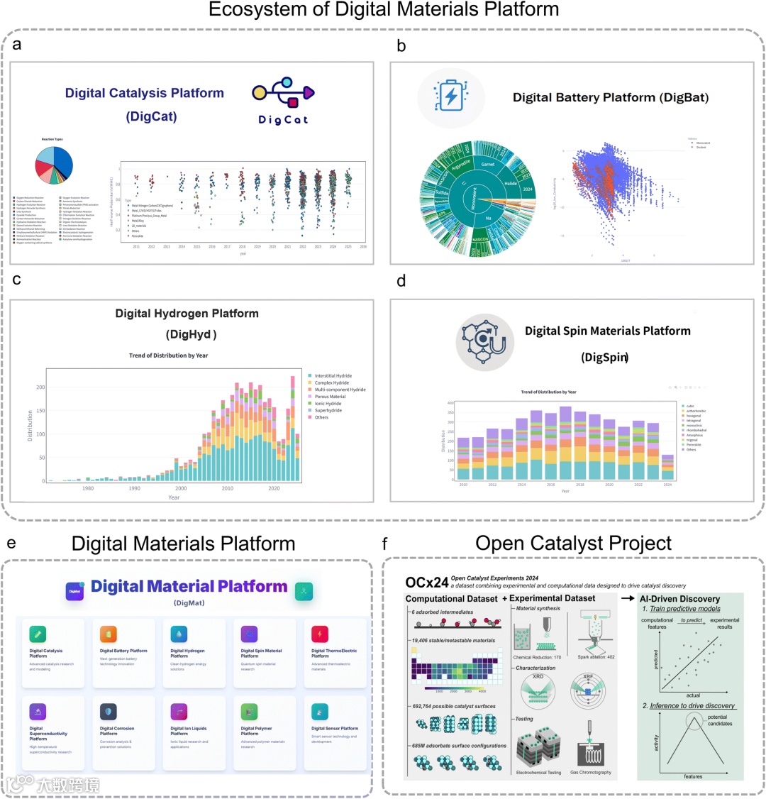 图2 数字材料平台的生态体系。(a)数字催化平台(DigCat:https://www.digcat.org)。(b)数字电池平台(DigBat:https://www.digbat.org)。(c)数字储氢平台(DigHyd:https://www.dighyd.org)。(d)数字自旋材料平台(DigSpin:https://www.digspin.org)。(e)数字材料平台(DigMat:https://www.digmat.org)。(f)开放催化剂项目(Open Catalyst Project)。