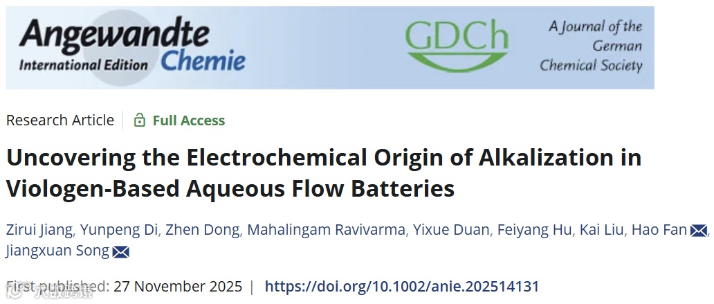 在“碳达峰、碳中和”战略目标驱动下,风能、光伏等清洁可再生能源正加速进入能源体系主流。然而,这类能源受气候与昼夜周期影响,具有明显的间歇性与波动性,亟需高安全、可规模化的储能技术作为支撑。水系有机液流电池(AORFB)因其低成本、高安全性以及功率与容量独立设计的独特优势,被认为是支撑大规模可再生能源并网的关键技术路径。其中,紫精(Viologen)类分子凭借良好的水溶性、可逆的氧化还原性能和低合成成本,成为负极活性材料研究的核心对象。然而,紫精在充放电循环中常伴随明显的电解液碱化,导致分子降解与容量衰减,尤其在两电子转移条件下更为严重,这成为制约其应用的关键瓶颈。因此,深入理解其碱化机制是提升紫精类水系有机液流电池综合性能的关键。