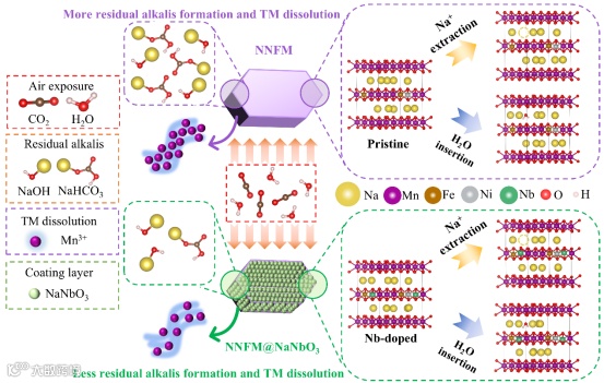 NaNbO3包覆和Nb5+体相掺杂协同提升层状氧化物稳定性的机理示意图 。