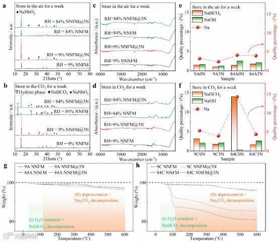 图4 NNFM与NNFM@3N在不同环境下的空气稳定性评估:(a, b)XRD图谱,(c,d)FTIR光谱,(e,f)酸碱滴定分析,(g,f) TGA曲线。