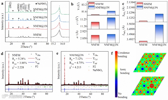图1. NNFM和NNFM@xN (x = 1, 3, 5)的晶体结构:(a)XRD图谱,NNFM和NNFM@3N的(b)晶胞参数与(c)层间距,(d)NNFM和(e)NNFM@3N的结构精修图谱,(f)NNFM(上)和NNFM@3N(下)的电子局域函数