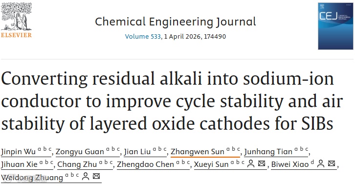 近日,北京科技大学庄卫东教授、孙学义研究员与有研(广东)新材料技术研究院肖必威教授合作,在著名学术期刊 Chemical Engineering Journal上发表了题为“Converting residual alkali into sodium-ion conductor to improve cycle stability and air stability of layered oxide cathodes for SIBs”的研究论文。该论文提出了一种“变废为宝”的协同改性策略,通过原位反应将有害的表面残碱转化为钠离子导体NaNbO3,并结合Nb5+体相掺杂,构筑了兼具物理防护与离子传输加速功能的界面层。该策略为解决层状氧化物正极材料在空气稳定性与长循环稳定性问题提供了新的解题思路。