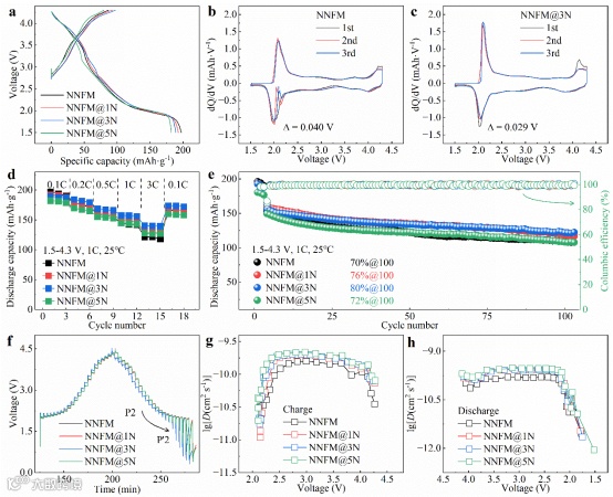 图2. NNFM和NNFM@xN (x = 1, 3, 5)的电化学性能:(a)首圈充放电曲线,(b,c)dQ/dV曲线,(d)倍率性能,(e)循环性能,(f)GITT曲线,(g)充电过程和(h)放电过程的离子扩散系数