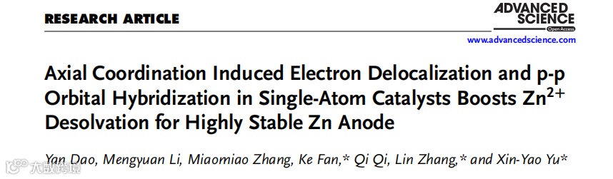 单原子催化剂中的轴向配位诱导电子离域和p-p轨道杂化提升锌离子脱溶剂化,实现高稳定锌阳极