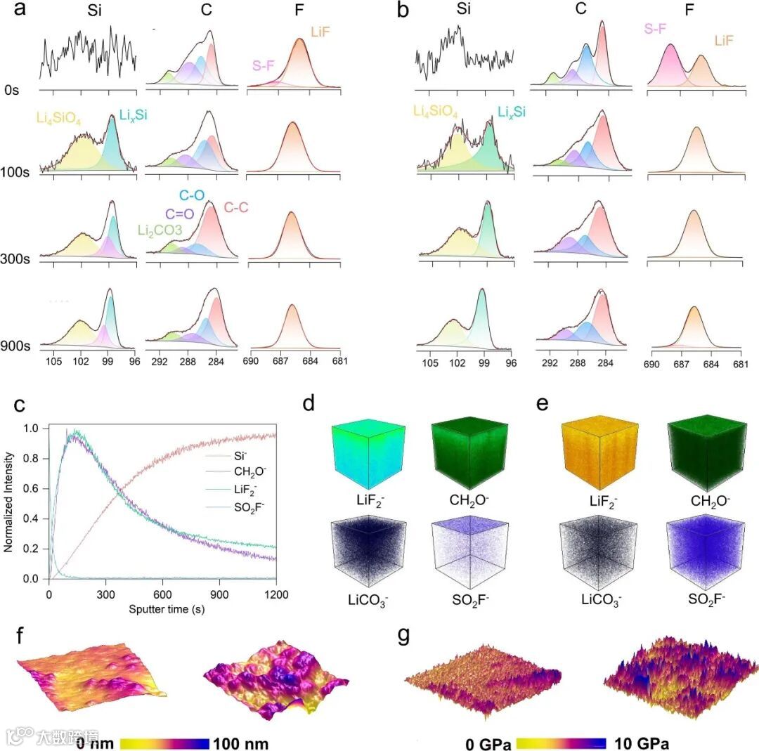 图3. 不同电解液下循环后的硅负极的界面表征分析