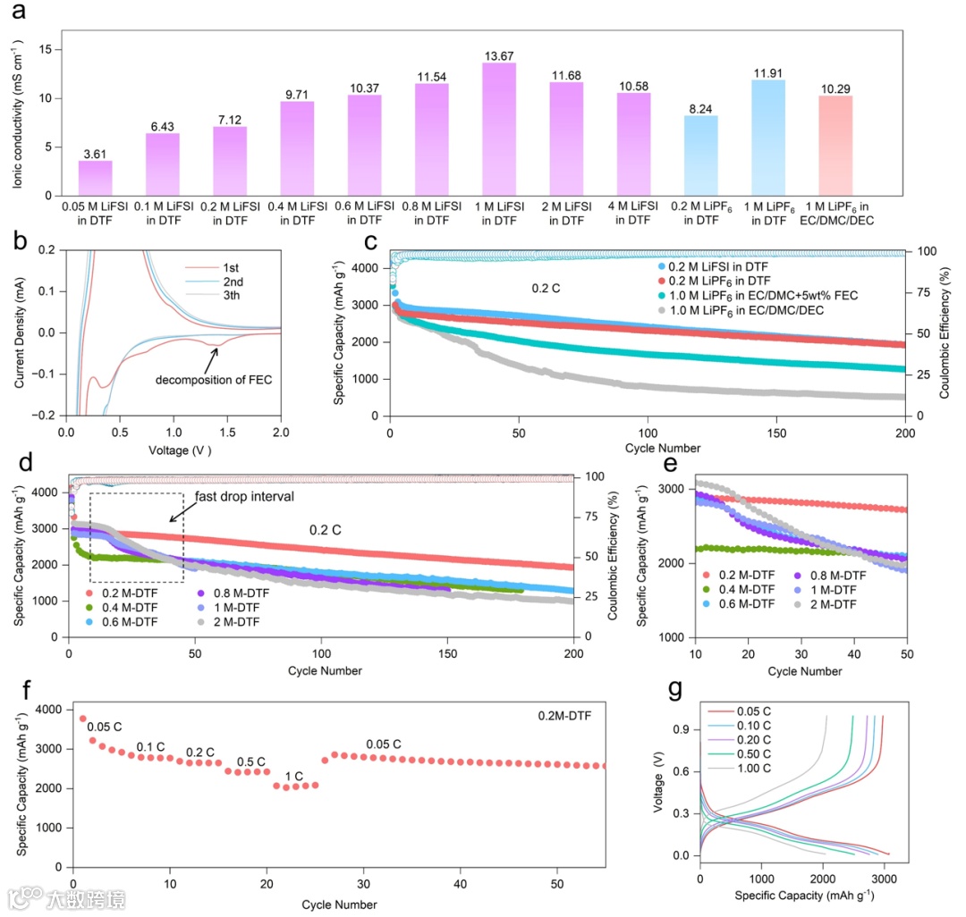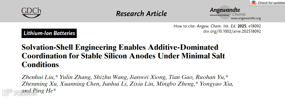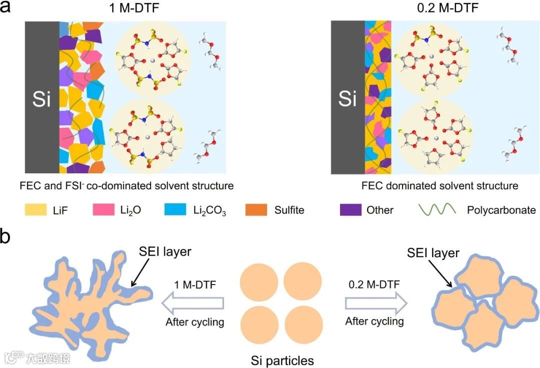 提出构筑以添加剂(FEC)主导的溶剂化结构,通过降低盐浓度以及引入弱配位的共溶剂将添加剂的稳定成膜作用发挥到最大,在硅负极表面形成以LiF和弹性聚合物复合的有机-无机SEI膜,能够有效适应硅负极的体积波动。