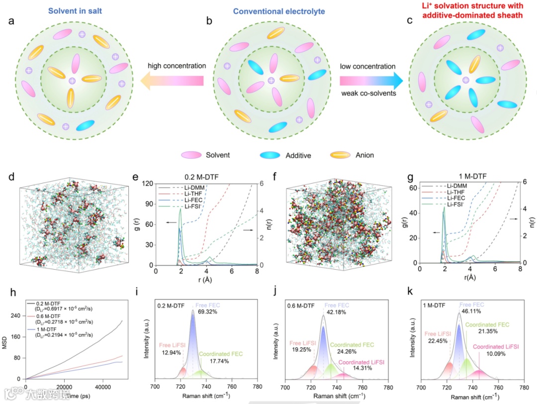 图1. 不同盐浓度电解液溶剂化结构表征与分析
