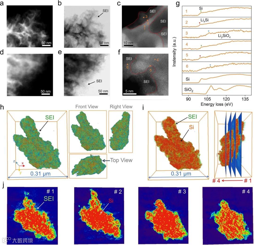 图4. 不同电解液下循环后的硅负极球差电镜表征及三维重构分析