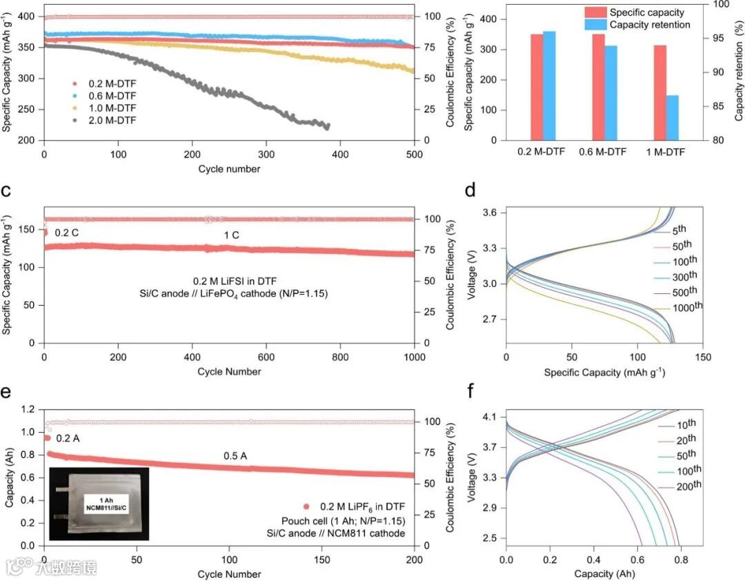 在0.2 M的超低盐浓度下实现了硅负极在0.2 C电流密度下200圈循环后仍然能够保持在2000 mAh g⁻¹的容量,而石墨负极在500次循环后仍然能够实现96%的容量保持率。在Si/C//LFP全电池中可以实现1000圈的稳定循环。在NCM811//Si/C软包电池中可以在200次循环后容量保持率仍保持78%。