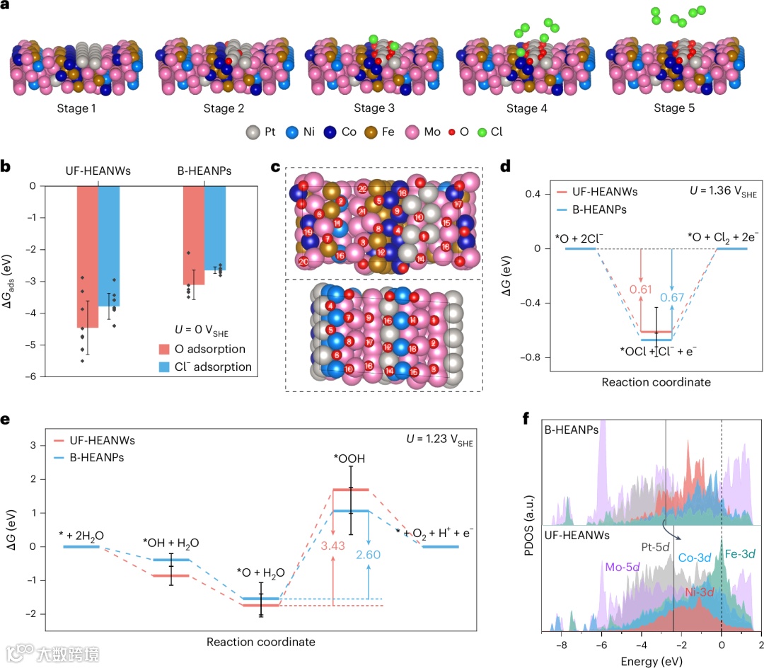 DFT计算显示,UF-HEANW表面对氧的吸附亲和力高于氯,这驱动了反应前表面的自发氧化。计算得到的自由能台阶表明,氯脱附步骤(*OCl + Cl⁻ → *O + Cl₂ + 2e⁻)是反应的限速步骤。UF-HEANWs因其高曲率位点和不饱和配位,使该步骤的自由能变化(0.61 eV)显著低于块体材料(0.67 eV),从而加速了动力学。此外,计算发现UF-HEANWs在析氧反应(OER)中形成的OOH中间体具有极高的势垒(3.43 eV),有效地抑制了析氧竞争,解释了其高CER选择性的根源。分部态密度(PDOS)分析揭示,UF-HEANWs的Pt d带中心向费米能级上移(-2.40 eV),增强了向OCl中间体的电荷转移,优化了中间体的吸附强度。这些发现从原子尺度证明了高熵合金通过几何与电子效应的协同作用,实现了对CER反应能垒的精准调控。