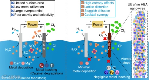 图1.海水电解电合成氯气:传统DSA电极的核心挑战 vs.高熵合金纳米线的独特优势