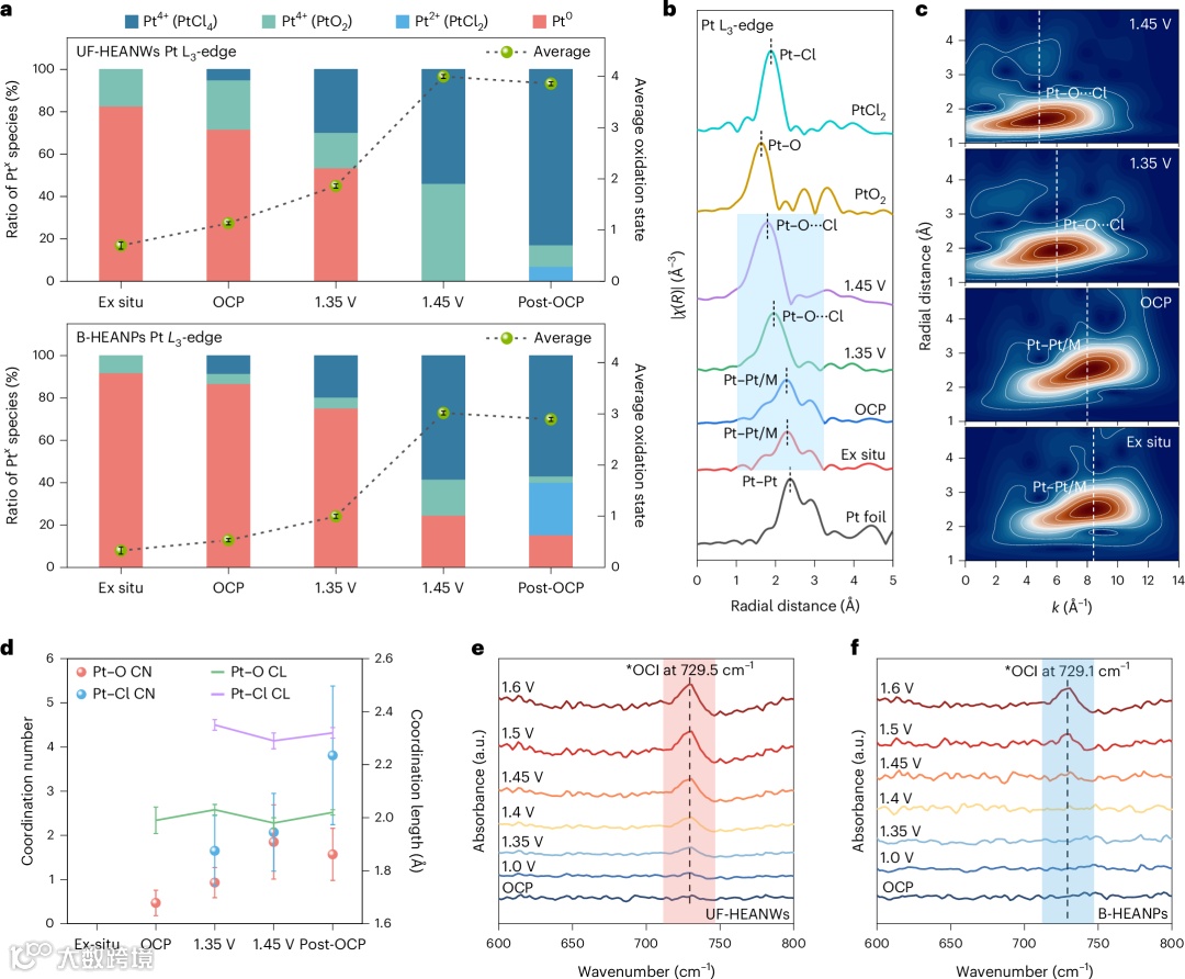 研究团队结合原位X射线吸收谱、原位红外光谱及理论计算,对催化剂反应过程中的结构演化进行系统解析。通过原位X射线吸收光谱(XAS)研究发现,UF-HEANWs在电势作用下会发生动态的结构演变。Pt L₃边能量随电位升高而发生白线强度增强,表明Pt从零价氧化为高价态(最高达Pt⁴⁺),且由于一维纳米线的超细特性,这种氧化过程比块体材料更早且更强烈。扩展X射线吸收精细结构(EXAFS)分析显示,在CER发生前(1.35 V),表面已原位形成了Pt–O配位。原位红外光谱(ATR-FTIR)进一步证实了这一点:在729.5 cm-1处检测到了*OCl中间体的特征峰,且其出现电位显著低于块体材料,表明Pt–O位点有效促进了氯离子的吸附。研究提出了一个五阶段催化循环:金属表面氧化形成活性Pt–O位点,随后通过Pt–O···Cl配置吸附Cl⁻,形成OCl中间体并释放氯气,最后表面保持氧化态以备下轮反应。这种不可逆的动态结构演变构建了最优的配位环境,解释了其超越传统催化剂的效率。