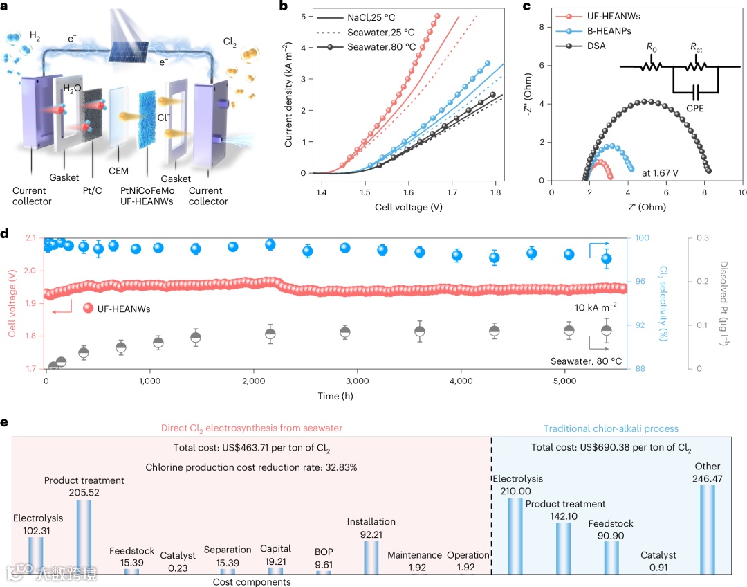 技术经济分析显示,高熵合金纳米线阳极能够显著降低电解能耗,同时海水替代高纯盐水原料,减少原料净化与处理成本。综合计算表明,相较于传统氯碱工艺,该新型体系的氯气生产总成本降低约32.8%,其中,由于高熵合金阳极显著降低了过电位,电解耗电成本减少了51.3%;而直接使用海水替代精制盐水,使原料成本降低了83.1%。海水直接制氯成本约463.7美元/吨,达到美国环境保护署2025年技术报告和工业能源效率研究中基准,显示出明确的产业化潜力。