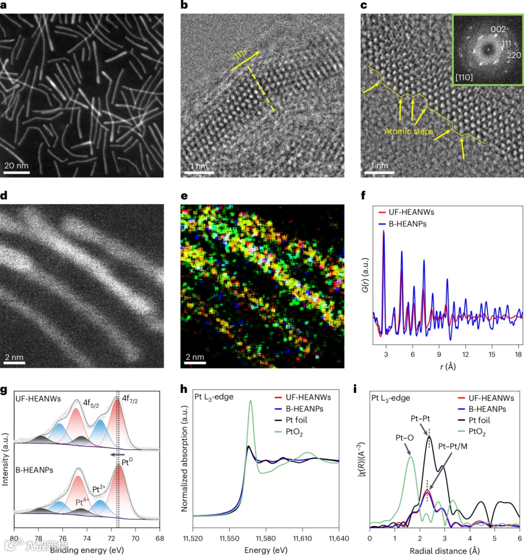 研究团队采用液相法成功合成了平均直径仅为1.26 nm的PtNiCoFeMo五元超细高熵合金纳米线(UF-HEANWs)。通过高分辨率透射电子显微镜(HRTEM)观察到,这种纳米线具有面心立方结构,并在垂直于生长轴的方向展现出特征性的{111}孪晶面。快速傅里叶变换(FFT)分析显示其存在明显的晶格畸变,形成了包含大量原子台阶和高曲率位点的缺陷丰富区域。能谱图(EDS)证实了五种金属元素在原子尺度的均匀分布,无相分离现象。同步辐射高能X射线衍射(HE-XRD)及配对分布函数(PDF)分析进一步揭示了其晶格收缩与无序性,Pt-Pt键长从块体箔片的2.39 Å缩短至2.31 Å。高分辨率X射线光电子能谱(HAXPES)表明,尽管存在显著的电荷重新分布,所有金属组分仍主要保持金属态。这种独特的超细一维结构及高熵效应诱导的几何和电子扰动,为其优异的催化性能奠定了结构基础。