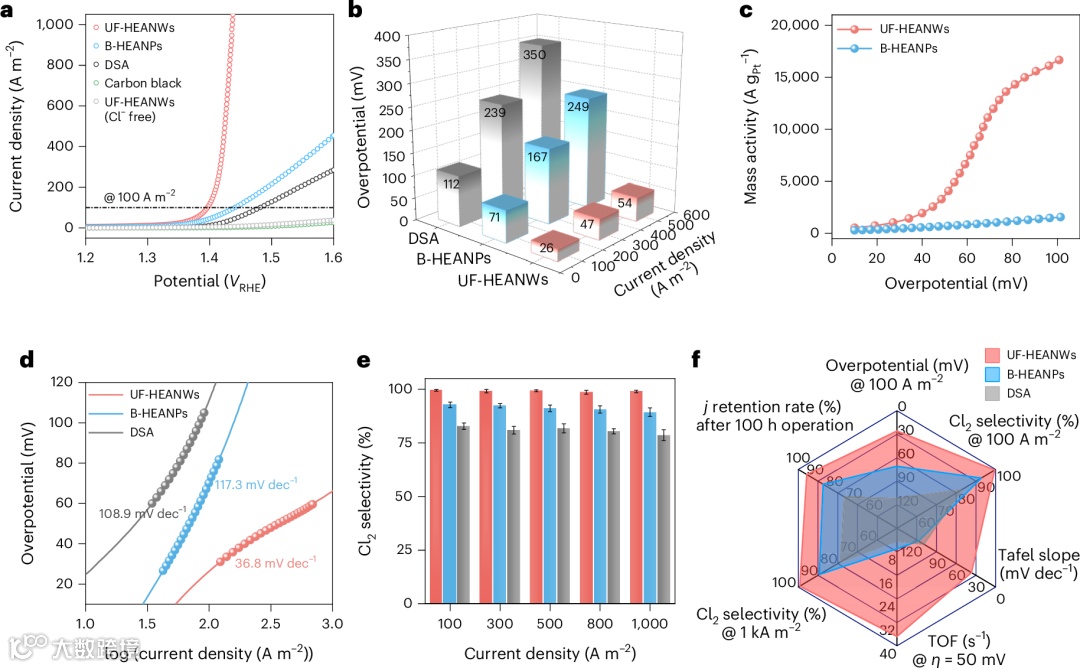 电化学测试表明,该HEA纳米线表现出极低的CER过电位(26 mV),远优于块体HEA(71 mV)与商业DSA(112 mV)。并且其展现优异反应动力学性能(Tafel斜率36.9 mV dec-1),质量活性14,000 A gₚₜ⁻¹,Cl2选择性超过99.5%,均显著优于块体HEA与商业DSA。在自主构建的流动海水电解器件中,该体系能够在工业级电流密度10 kA m-2下实现1.92 V的低槽压,并保持98%以上氯气选择性,连续运行超过5500小时,性能几乎没有衰减,且铂金属流失量极低,显示出极高结构稳定性与抗腐蚀能力。该真实海水条件下的系统测试同时证明,该体系在高温运行中仍可维持低电压与稳定输出,具备实际工程应用潜力。