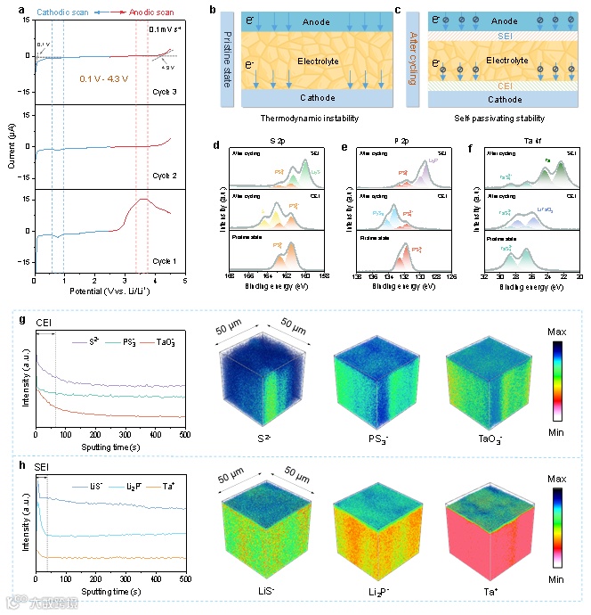 图4. Li5.5P0.94Ta0.06S4.5Cl0.75Br0.75与电极之间的界面稳定性。 (a) Li5.5P0.94Ta0.06S4.5Cl0.75Br0.75在扫描速率为0.1 mV s-1下的前三圈循环伏安曲线。(b) 电解质与电极之间热力学不稳定示意图。(c) 在电解质-电极界面形成稳定SEI和CEI层后的自钝化稳定示意图。(d-f) 显示Li5.5P0.94Ta0.06S4.5Cl0.75Br0.75原始状态和循环后的XPS谱图。(d) S 2p区域。(e) P 2p区域。(f) Ta 4f区域。(g, h) 揭示CEI和SEI层中成分分布的ToF-SIMS表征。(g) S₂⁻、PS₃⁻和TaO₃⁻成分在500秒溅射时间内的分布曲线及相应的3D分布图像。(h) LiS⁺、Li₂P⁺和Ta⁺成分在500秒溅射时间内的分布曲线及相应的3D分布图像。