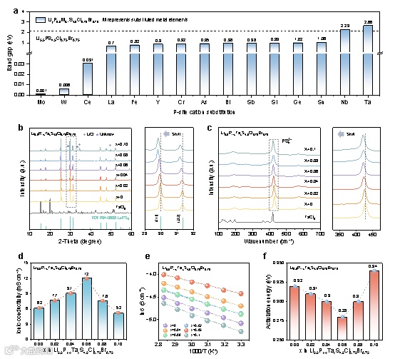 离子电导率与阴离子占位无序度(构型熵反映)息息相关,通过调控卤素比例(Li5.5PS4.5Cl1.5-xBrx),确定Li5.5PS4.5Cl0.75Br0.75具有最大的构型熵,对应最高的离子电导率6.2 mS cm-1。在最优卤素组成基础上进一步对P位进行取代。如图2a所示,DFT计算表明Ta5+取代P5+具有最大带隙(2.66 eV)。对电解质来说,带隙越大表明电子电导率越低,有利于抑制电池内部自放电和锂枝晶生长。实验证实,当Ta5+掺杂量为6 mol%时(Li5.5P0.94Ta0.06S4.5Cl0.75Br0.75),离子电导率进一步提升至12 mS cm-1,且活化能降至最低(0.28 eV);当超过6 mol%时,由于超过固溶极限而导致杂质相析出,从而对锂离子传输造成阻碍。